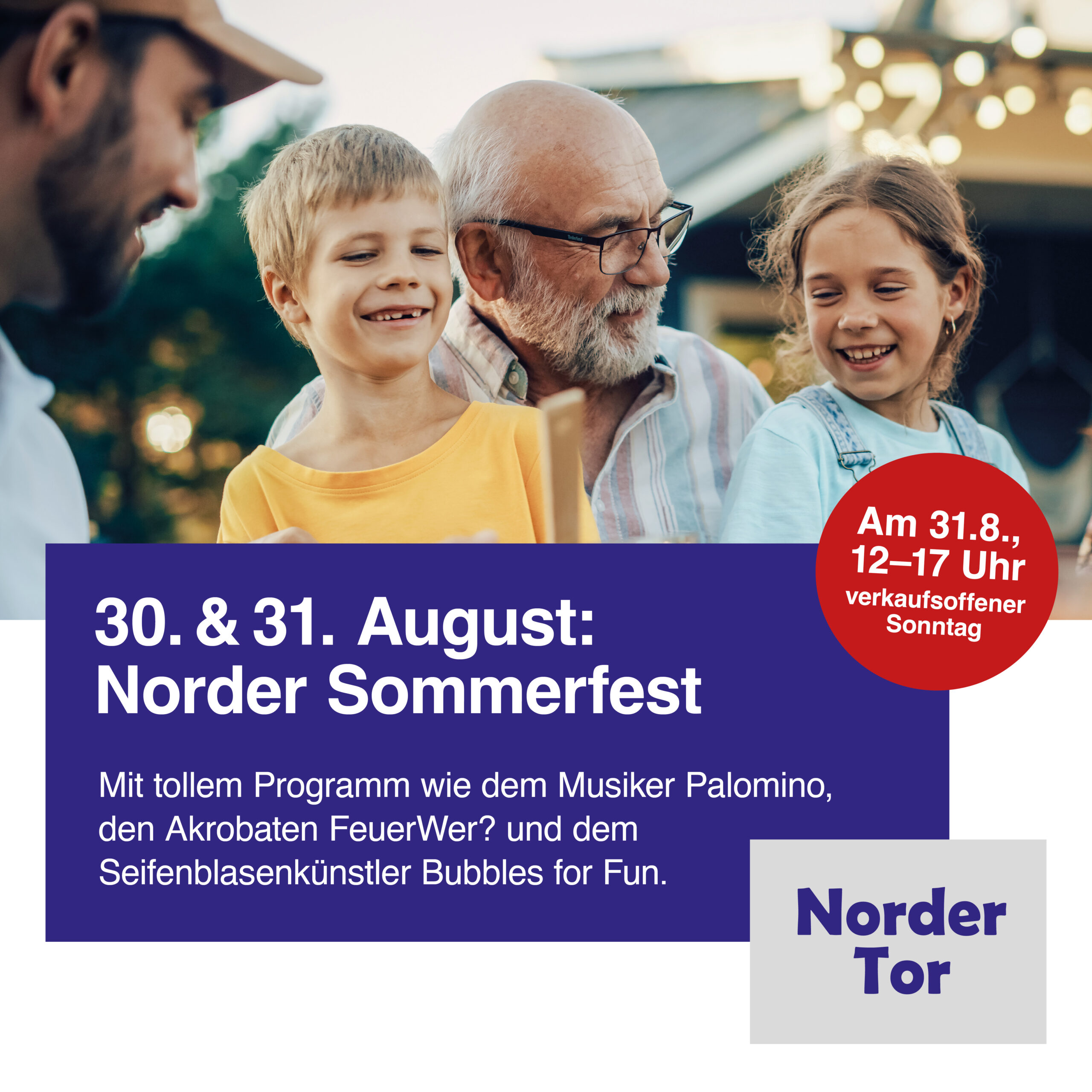 Am 30. & 31. August feiern wir zusammen mit der Innenstadt Norden das Norder Sommerfest – mit Musik, Akrobatik, Seifenblasenkunst und vielen Highlights für die ganze Familie